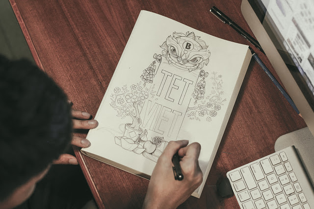 Trước hết, bắt đầu làm việc với một ý tưởng rất đầu tiên phác thảo và khám phá các khái niệm sau đó được thực hiện hoàn toàn bằng Handcraft trên giấy vật liệu nghệ thuật và màu tự nhiên. Bên cạnh đó, kiểu fontstyle cũ của thế kỷ 70-80 cũng đã được khai thác và cải cách cho kiểu chữ "Tet Viet". Hi vọng Poster này sẽ truyền cảm hứng cho cộng đồng để bảo tồn bản sắc văn hóa dân tộc.
